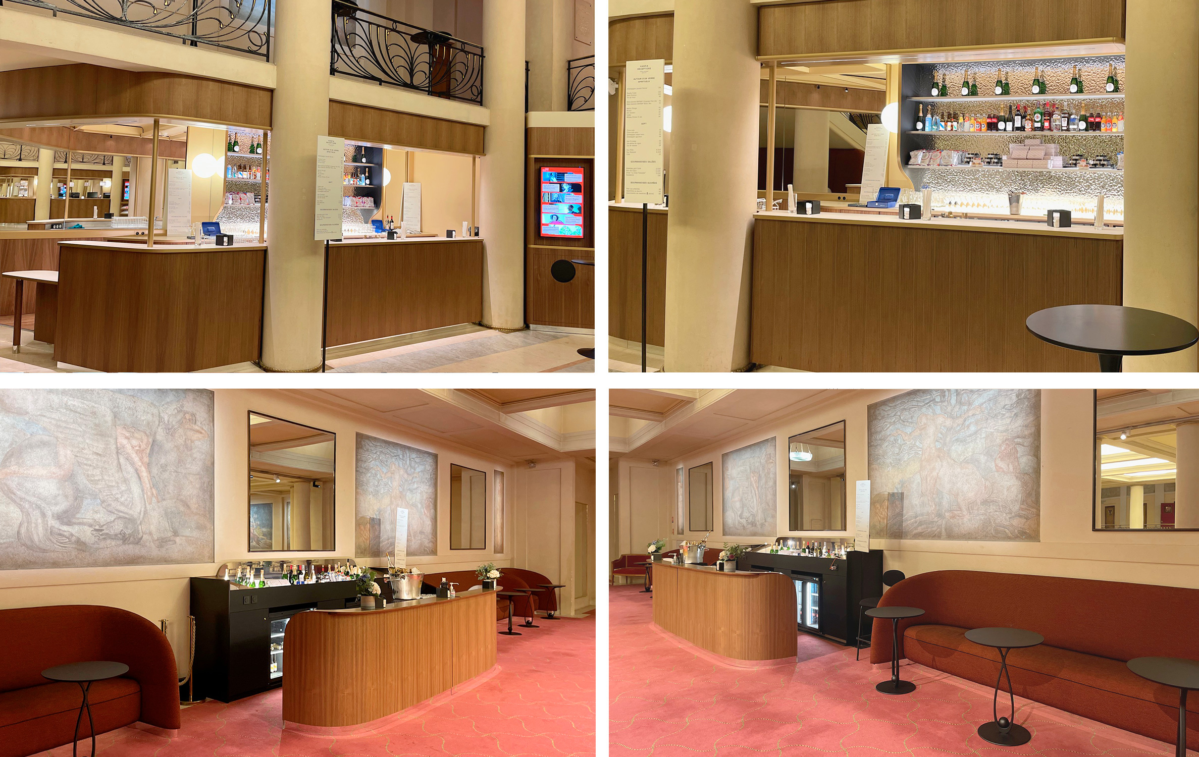 Les Bars de la Corbeille (1er étage) et du 1er balcon (2e étage) proposent des grignoteries salées, du Champagne Laurent-Perrier, des Vins – Saint-Emilion, Pouilly Fumé – et des eaux minérales.