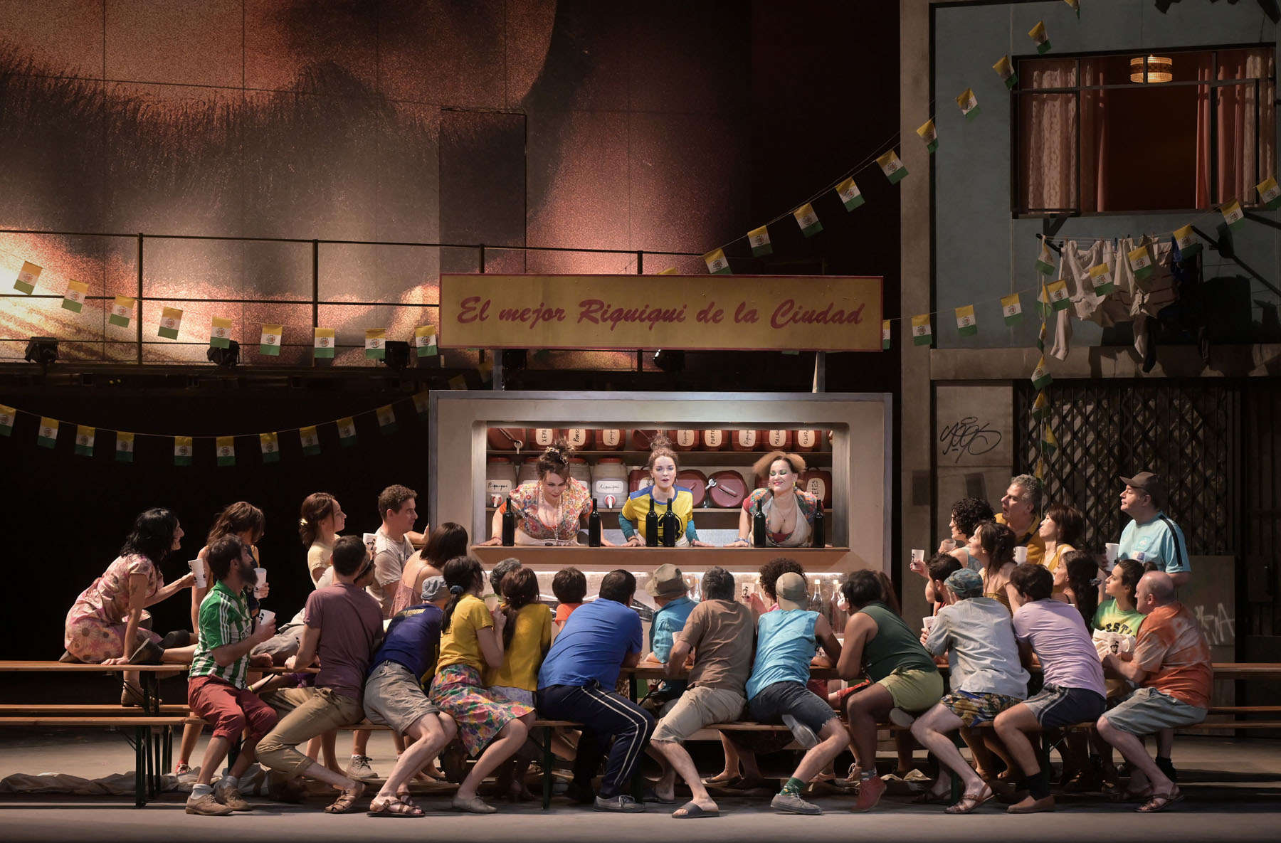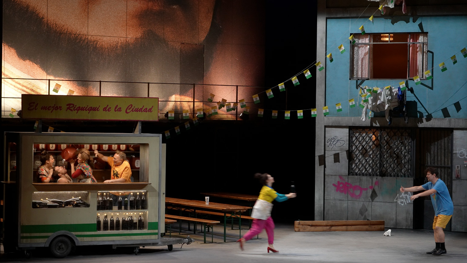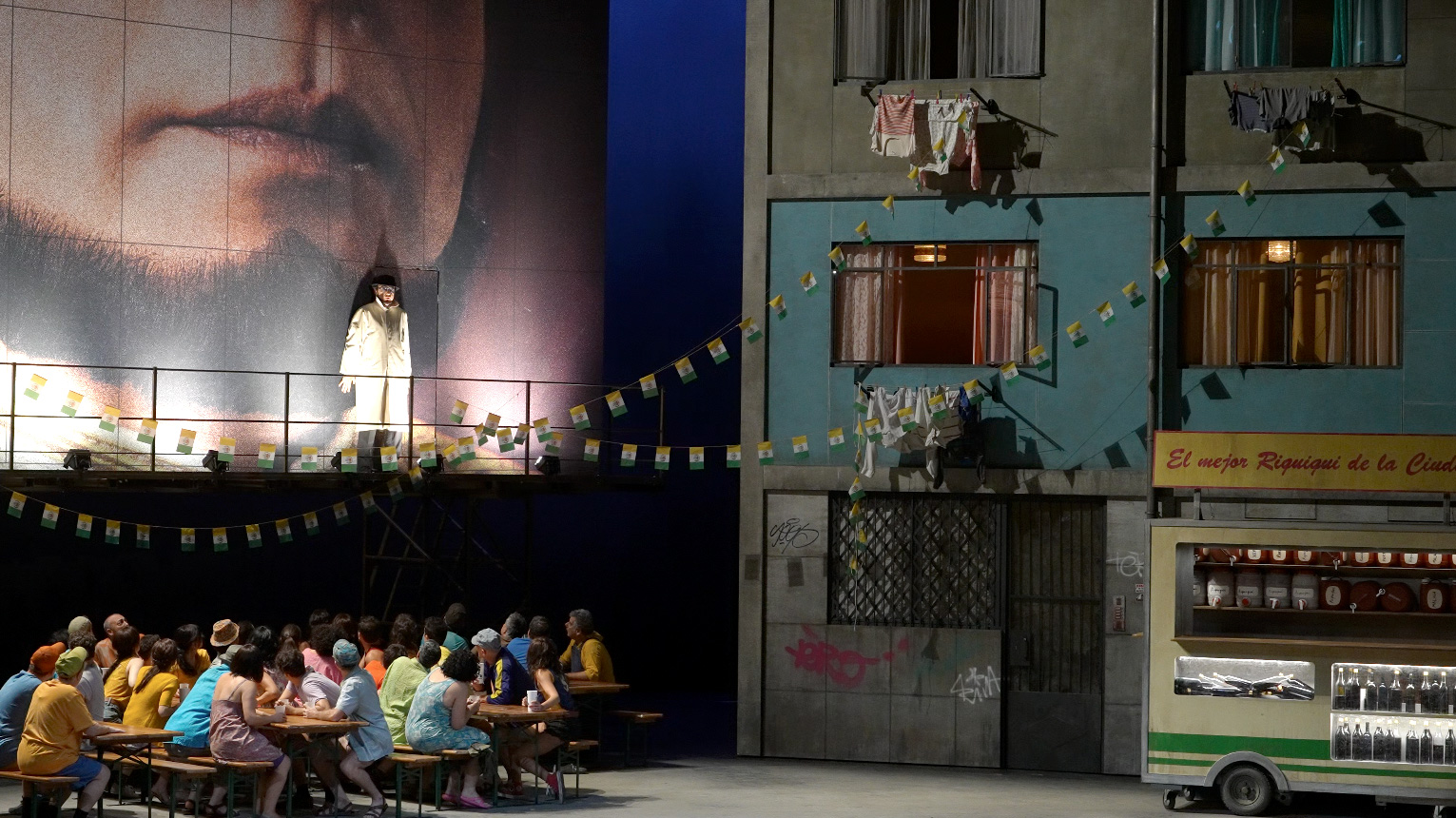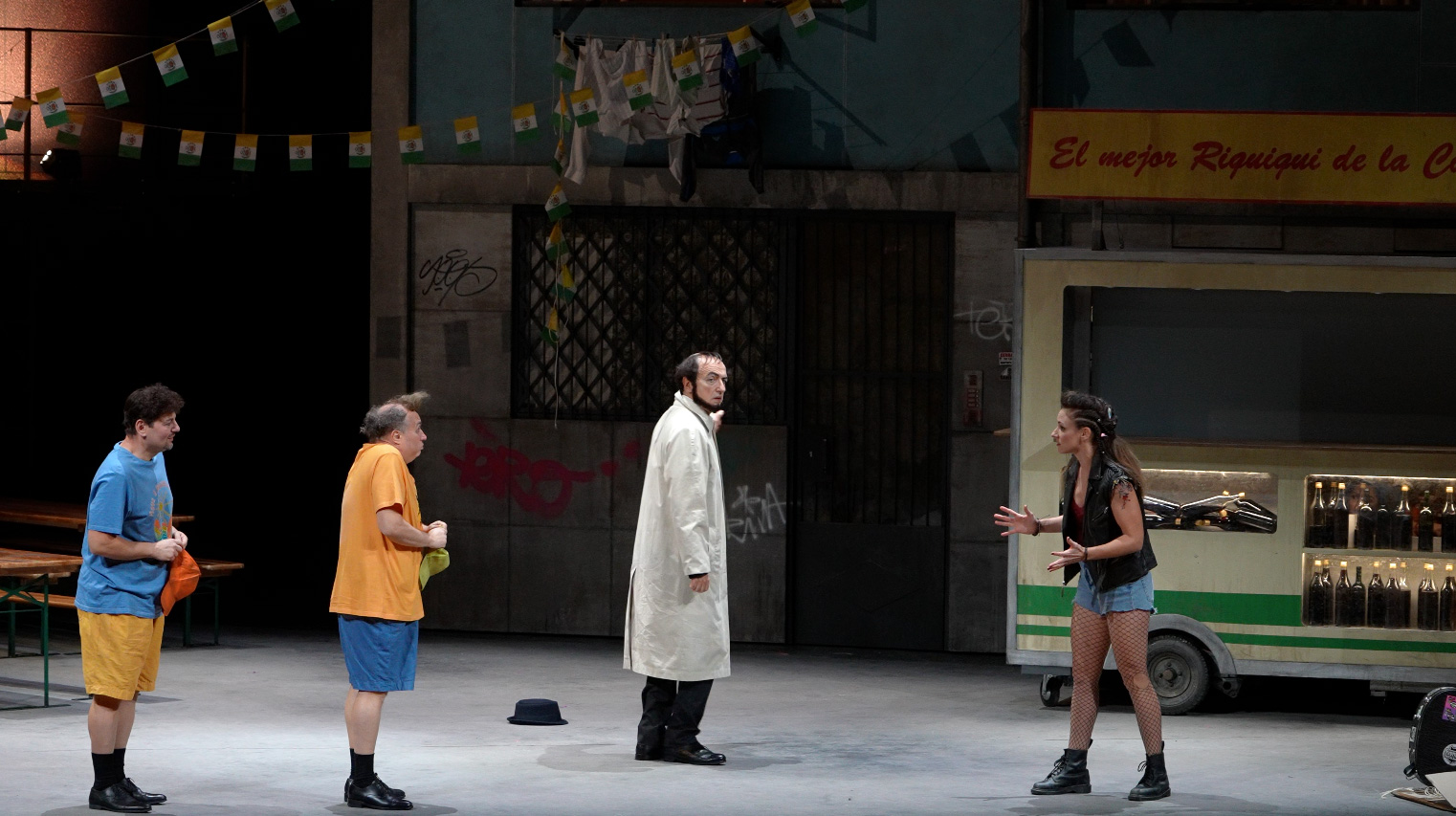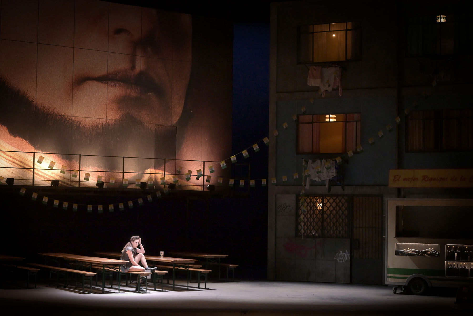 Pour sa scénographie, Chantal Thomas a imaginé un premier acte situé sur une place publique dominée par un immense portrait du dictateur Don Andrès (réalisée d’après la photo du chanteur interprétant le rôle). Les trois cousines y tiennent un food truck qui sert essentiellement de l’alcool bon marché. L’immeuble au fond accueille la garçonnière de Don Andrès. Des bancs et des chaises et le food truck changent de place et de fonction à chaque scène. Piquillo et La Périchole sont des musiciens de rue un peu punk rock.