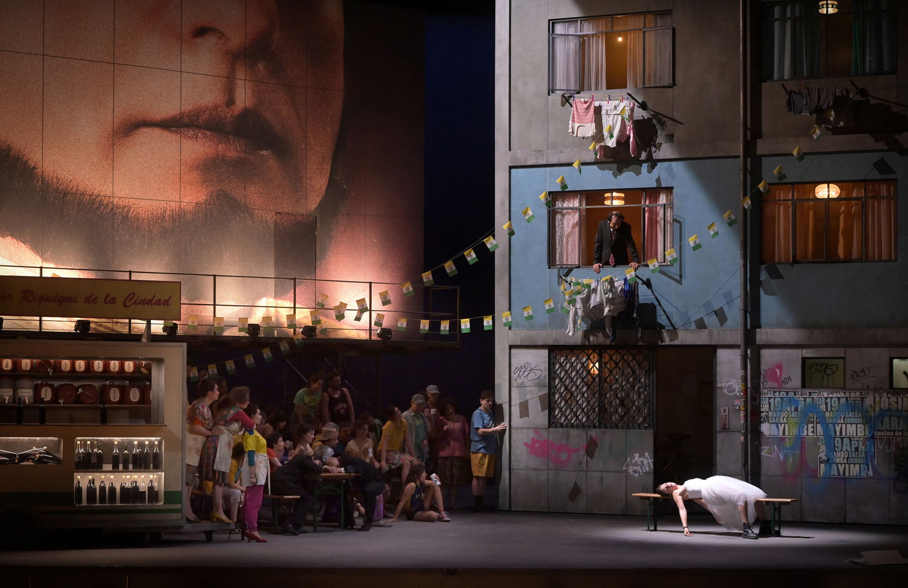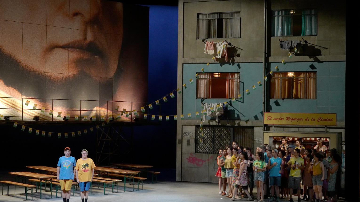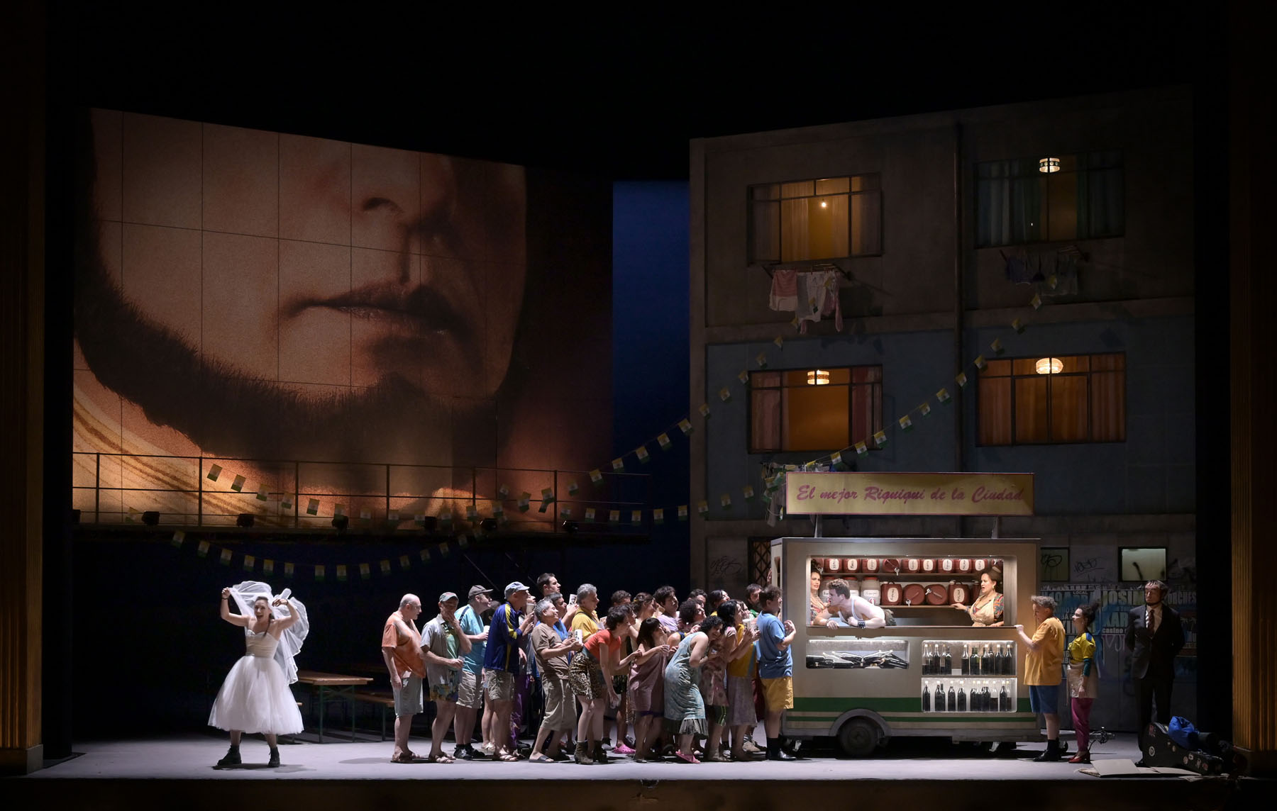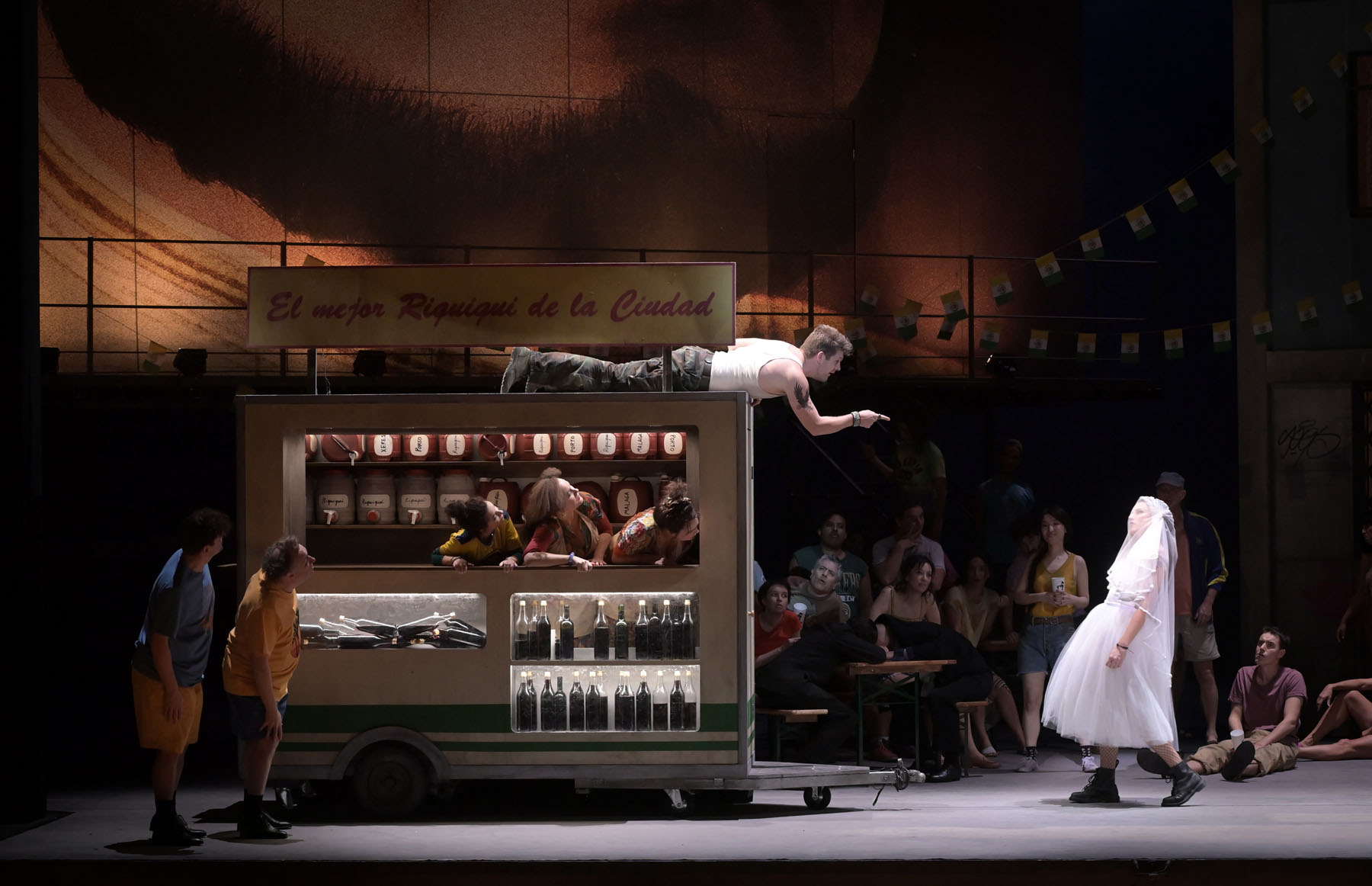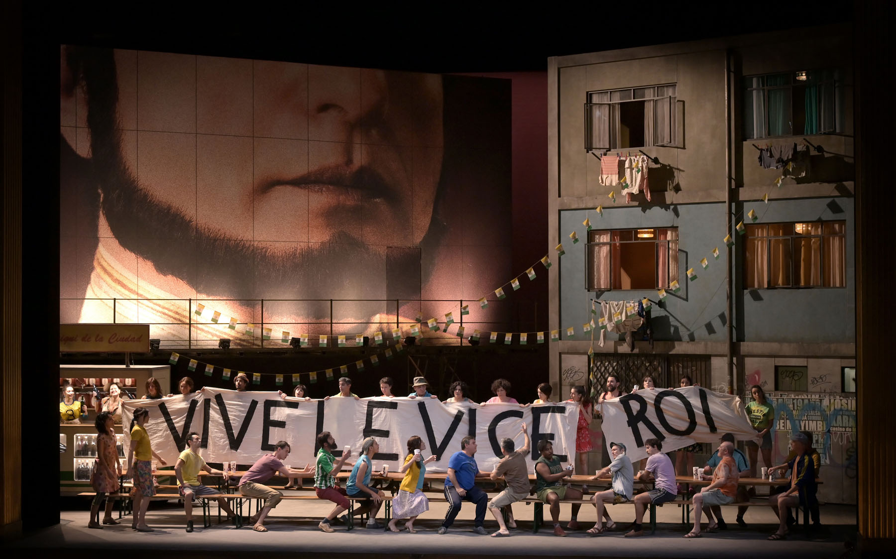 Pour sa scénographie, Chantal Thomas a imaginé un premier acte situé sur une place publique dominée par un immense portrait du dictateur Don Andrès (réalisée d’après la photo du chanteur interprétant le rôle). Les trois cousines y tiennent un food truck qui sert essentiellement de l’alcool bon marché. L’immeuble au fond accueille la garçonnière de Don Andrès. Des bancs et des chaises et le food truck changent de place et de fonction à chaque scène. Piquillo et La Périchole sont des musiciens de rue un peu punk rock.