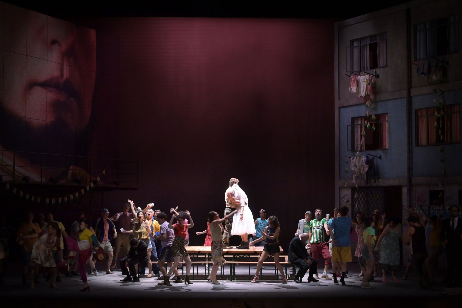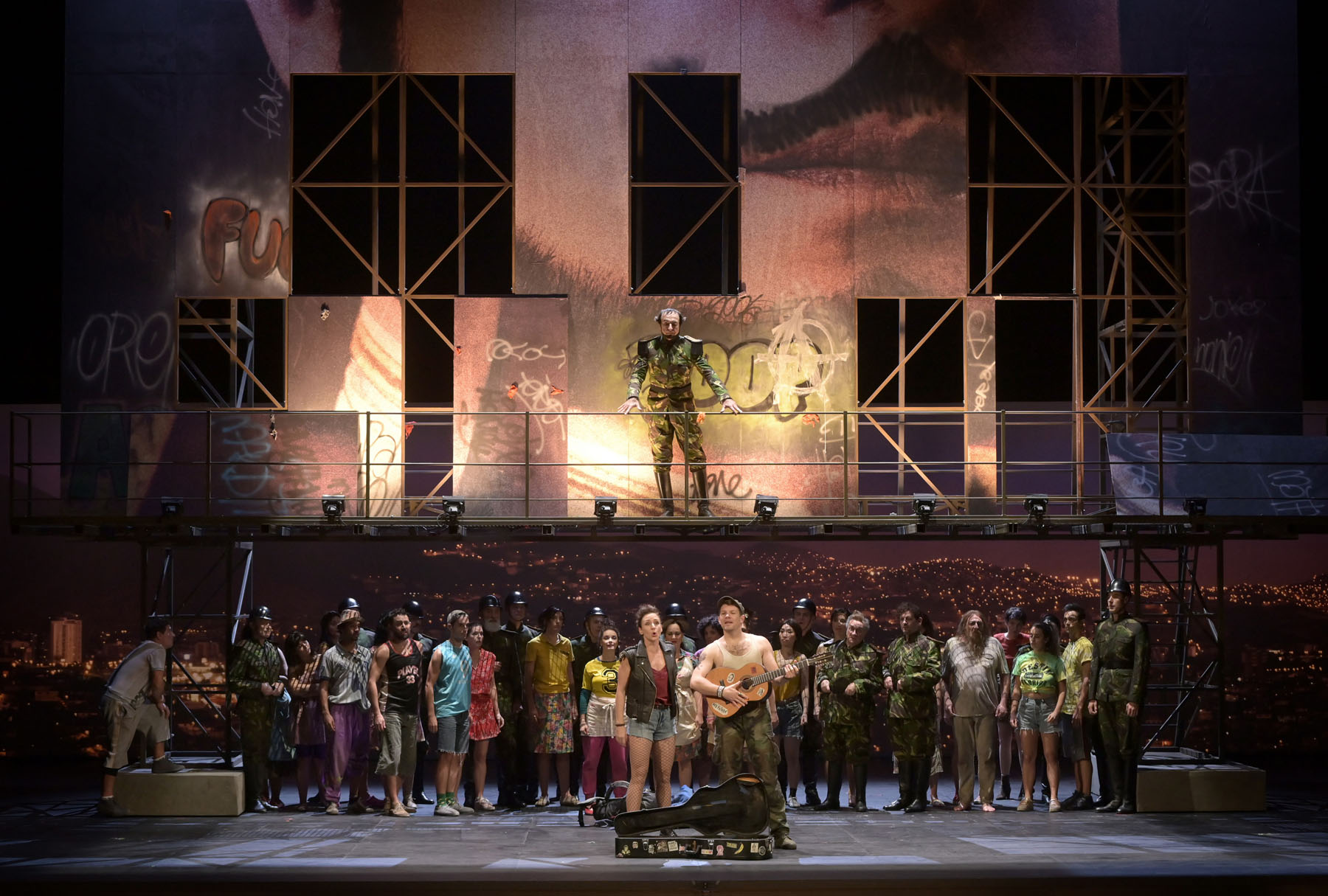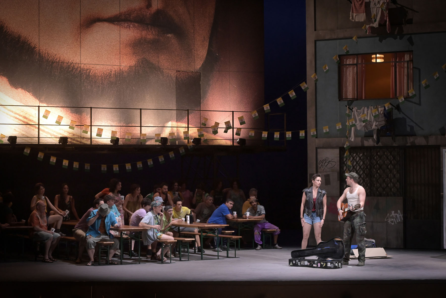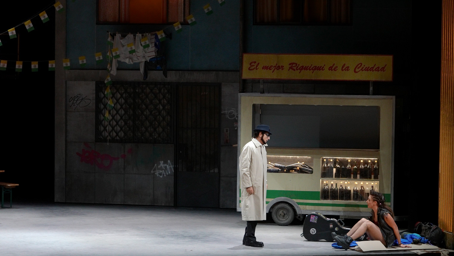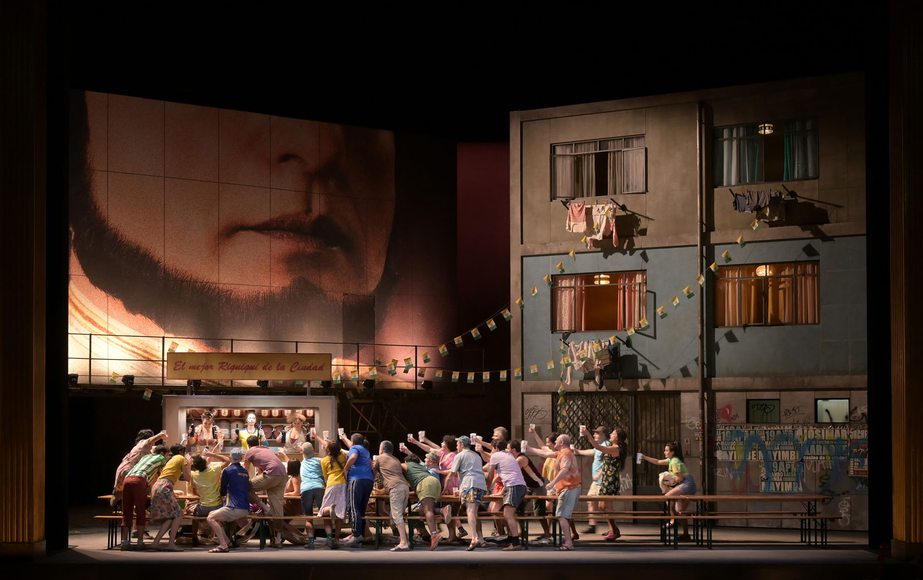 Pour sa scénographie, Chantal Thomas a imaginé un premier acte situé sur une place publique dominée par un immense portrait du dictateur Don Andrès (réalisée d’après la photo du chanteur interprétant le rôle). Les trois cousines y tiennent un food truck qui sert essentiellement de l’alcool bon marché. L’immeuble au fond accueille la garçonnière de Don Andrès. Des bancs et des chaises et le food truck changent de place et de fonction à chaque scène. Piquillo et La Périchole sont des musiciens de rue un peu punk rock.