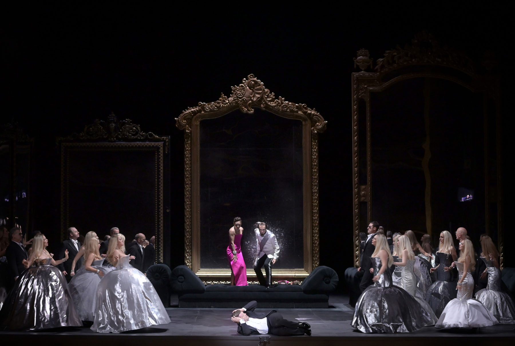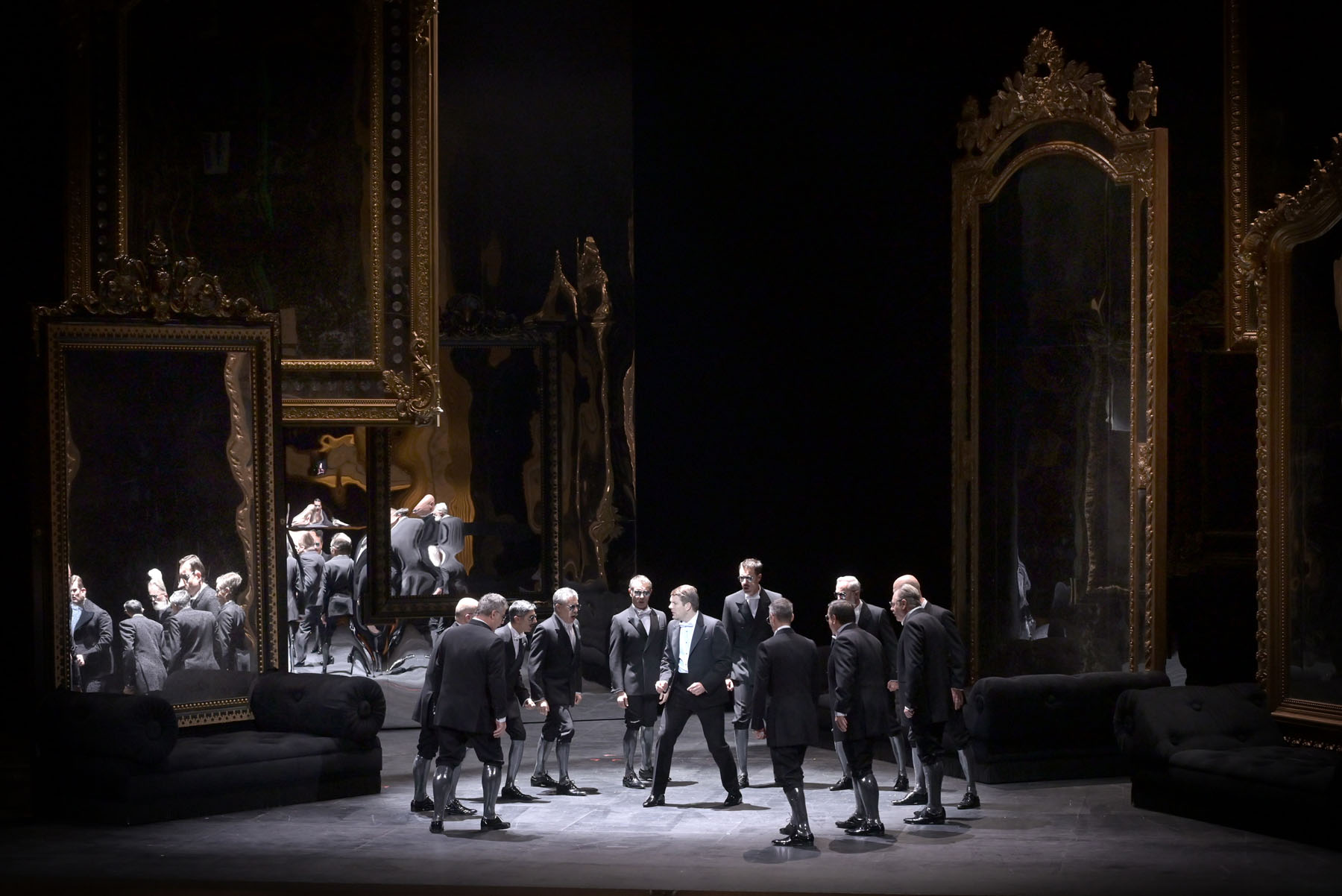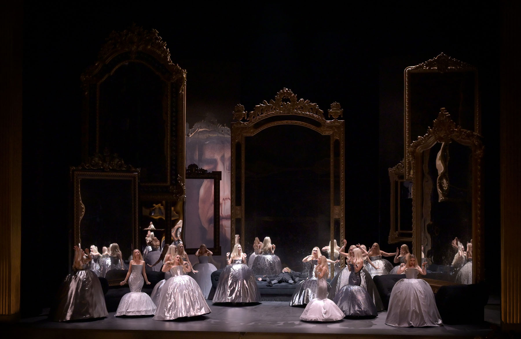 Pour le deuxième acte, l’action se transporte dans le palais de Don Andrès, où les courtisanes ressemblent à de blondes hollywoodiennes parfaitement interchangeables entre elles, dans des robes argentées (chacune différente). Le décor est composé de miroirs sur roulettes, qui reflètent tantôt l’action, tantôt les portraits de Don Andrès disséminés dans le décor.
