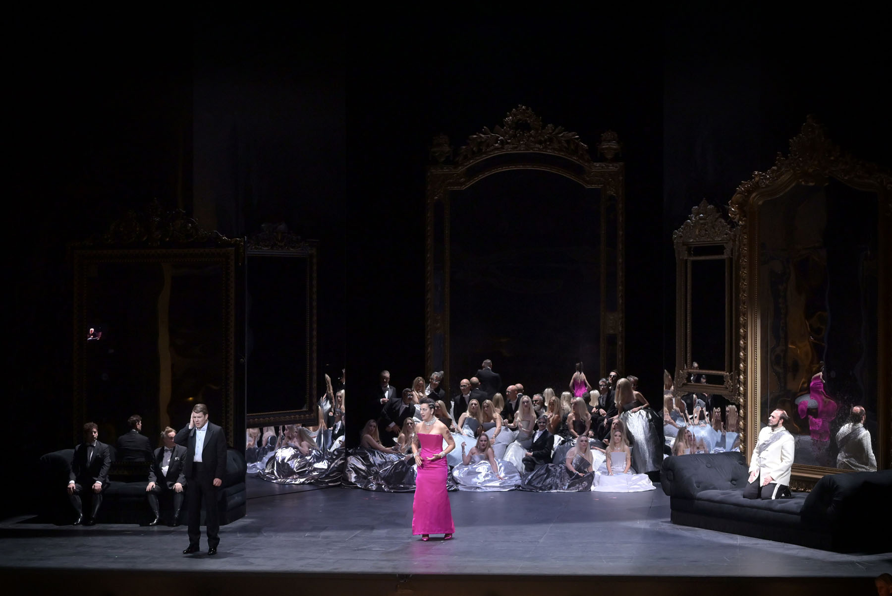 Les décors de Chantal Thomas (sombre palais avec son intérieur nouveau riche, grands miroirs et canapés noirs), les lumières chatoyantes de Michel Le Borgne et les costumes de Laurent Pelly (amusante démultiplication de