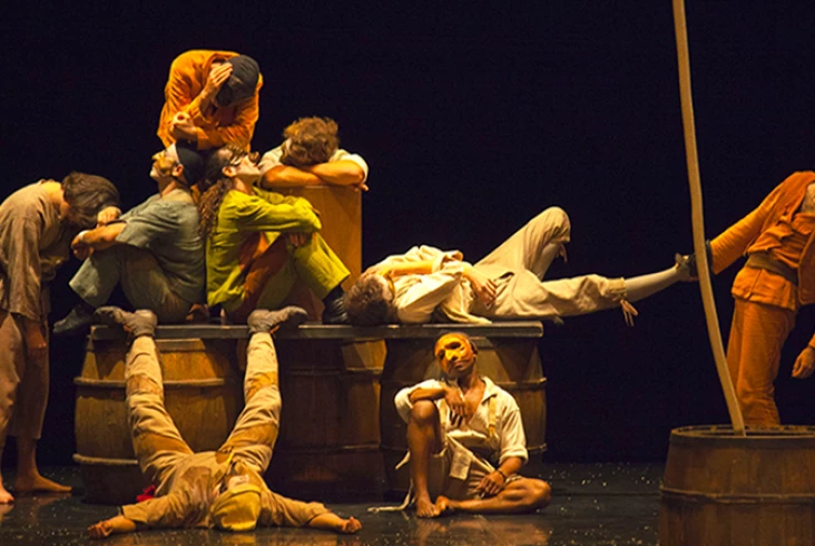 This baroque carnival takes place in all its splendour in the sumptuous and grotesque world of mid-seventeenth-century Italy. A poetic gathering of acrobats, jugglers, mime artists, singers and musicians offers a genre-defying show at the interface of several artistic disciplines, featuring popular music, baroque choral singing and commedia dell’arte. An invitation to young and old alike to be transported to another world.
