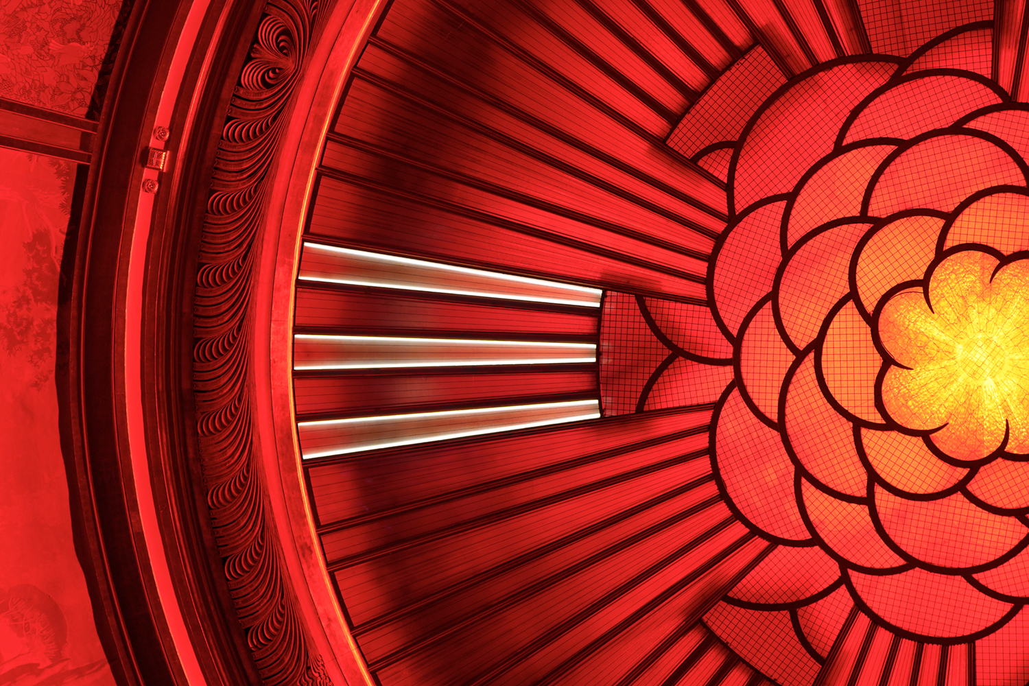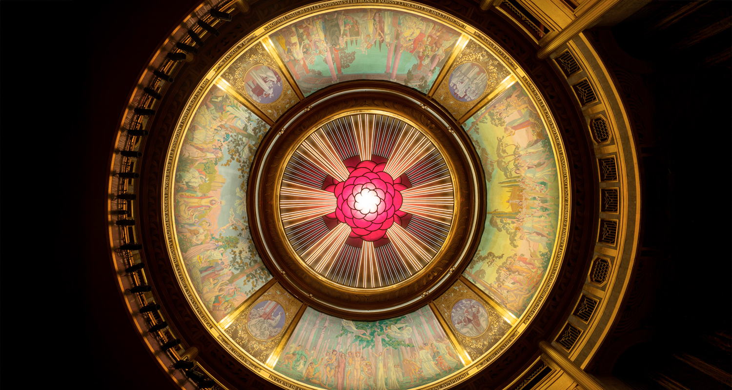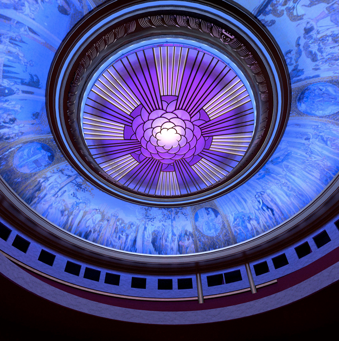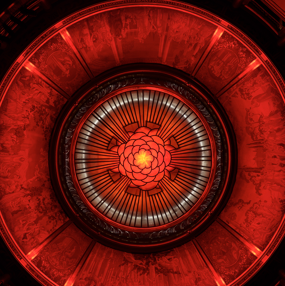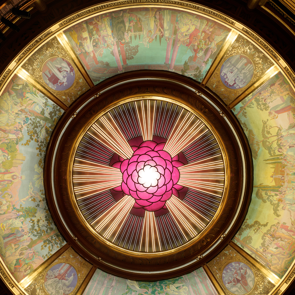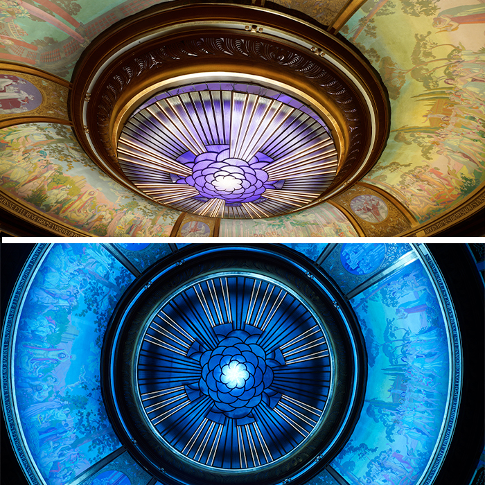 Pour mener à bien ce chantier, il a fallu, au-delà de nombreuses études préparatoires en amont (relevés en 3D, modélisation, étude structurelle et travail en lumière assistée par ordinateur…), imaginer le moyen de dépose des 241 sources lumineuses en place et la pose des nouveaux modules. Ces deux phases n’ont pu se réaliser qu’en organisant l’intervention de cordistes expérimentés, unique moyen d’accéder à l’espace de travail sans endommager les verres d’époque. Cette phase délicate achevée s’est poursuivie par le réglage des différents paramètres permettant le déploiement des tableaux lumineux historiques que de nombreuses recherches documentaires ont permis de reconstituer jusqu’à la création des nouvelles partitions lumineuses en jouant sur les intensités lumineuses et les couleurs. C’est donc ce nouveau joyau de technicité colorimétrique que vous pouvez admirer à chacune de vos venues et qui a permis également de rendre toutes sa vivacité et sa présence aux peintures.