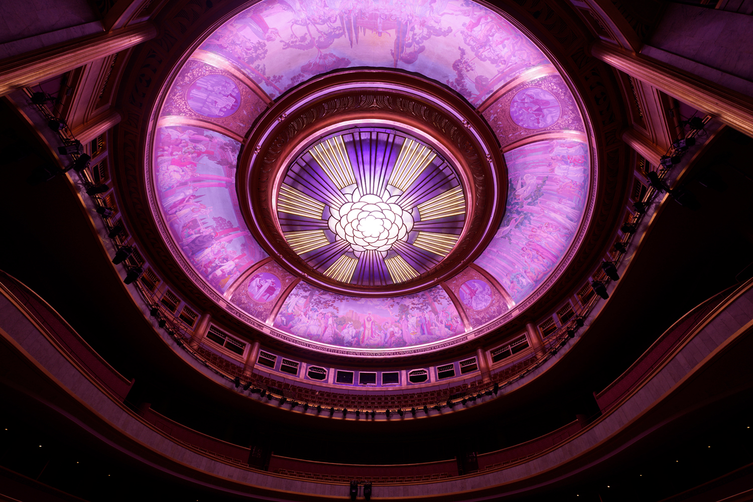 Lors de son ouverture au printemps 1913, le théâtre avait d’emblée séduit par sa modernité : modernité de sa structure en béton armé qui permettait pour la première fois de créer des balcons suspendus sans colonnes, par sa façade sans fioritures ornementales annonçant le futur mouvement art déco et sa programmation flamboyante. Si une importante de campagne de rénovation de la salle a eu lieu au mitan des années 80, suivie de chantiers réguliers depuis cette date, le temps était venu de se pencher sur l’extraordinaire plafonnier de la salle.