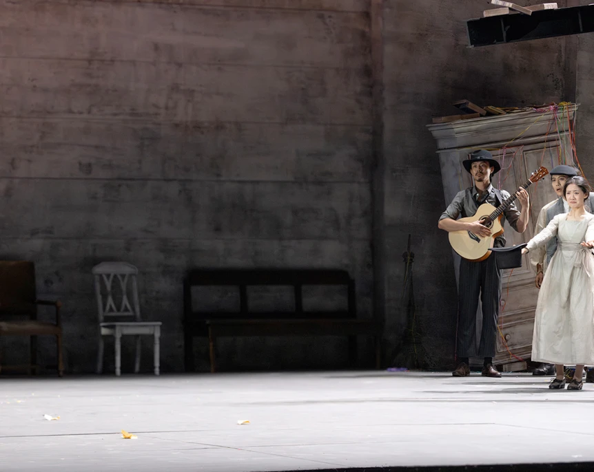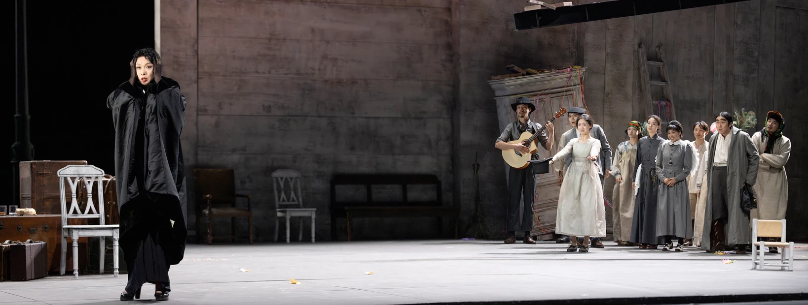 La Cerisaie est la dernière œuvre du dramaturge russe Anton Tchekhov. Créée en 1904 au Théâtre d’Art de Moscou, elle est aujourd’hui considérée comme l’un des grands classiques du théâtre du XXe siècle, traduite dans de nombreuses langues et jouée à travers le monde. La version ici présentée est une adaptation du metteur en scène lituanien Rimas Tuminas, disparu récemment. Réputé pour ses lectures sensibles et visuellement poétiques de Tchekhov, il a imaginé en 2024 cette version de La Cerisaie portée par une distribution exclusivement chinoise. Cette version a été créée à Shanghai en août 2024 sous la direction artistique de Jin Xing qui par ailleurs tient le rôle principal. L’intrigue retrace le retour d’une propriétaire terrienne au sein de son domaine familial – célèbre pour sa vaste cerisaie – à la veille de sa mise aux enchères pour dettes. Sourde aux solutions proposées pour sauver la propriété, elle en laisse finalement la vente à un ancien paysan devenu entrepreneur. La famille s’éloigne alors que résonne le bruit des arbres abattus. À travers cette histoire, Tchekhov explore l’impuissance d’une noblesse déclinante et l’aspiration tout aussi vaine d’une bourgeoisie émergente en quête de sens dans sa récente prospérité. La pièce met en lumière les bouleversements sociaux et économiques qui marquent la Russie du tournant du XXe siècle : l’ascension de la classe moyenne après l’abolition du servage et l’effritement du pouvoir aristocratique.